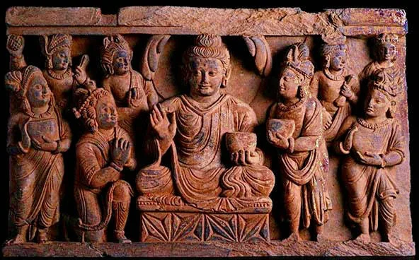 The stone relief depicts the Buddha and his buddies playing ancient Tibetan singing bowls.